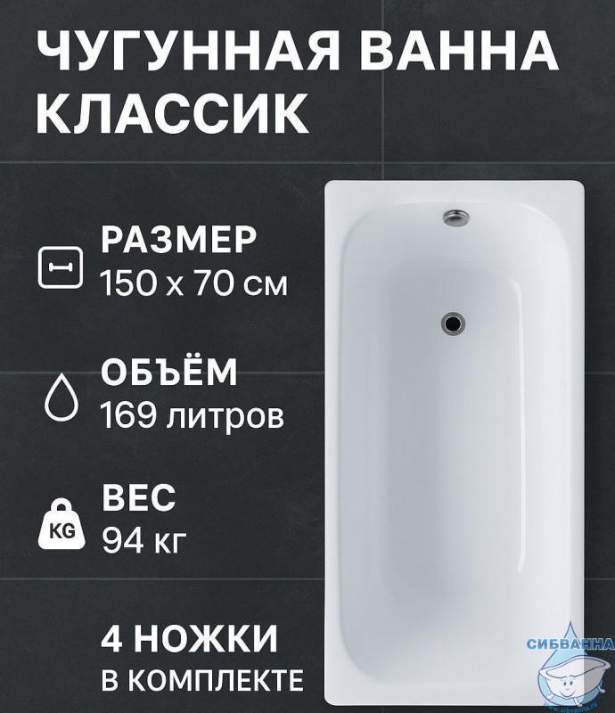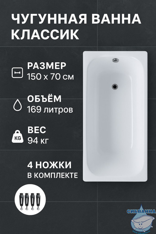 Чугунная ванна Универсал Классик 150х70 с ножками