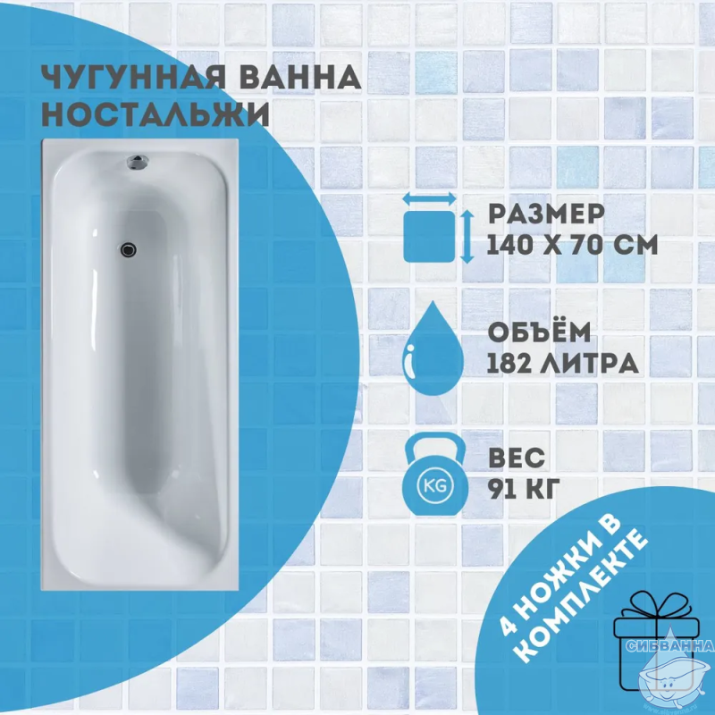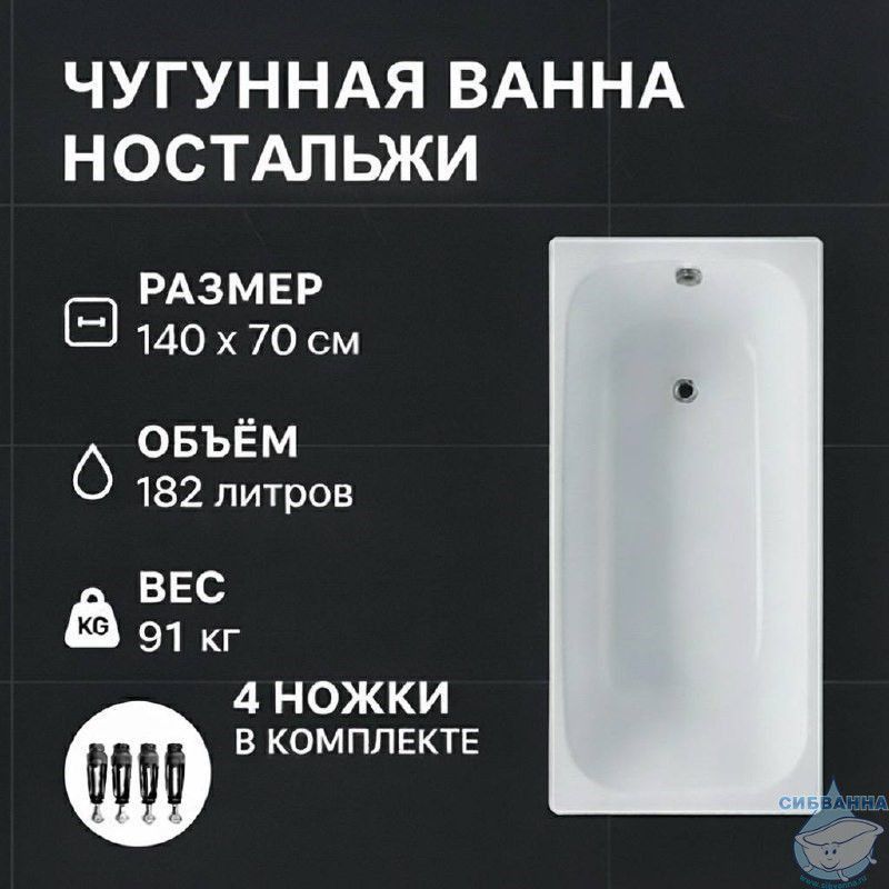 Чугунная ванна «Ностальжи» 140х70 представляет собой классическую модель с большим полезным объемом чаши.