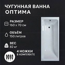 Чугунная ванна «Оптима» - ровные линии, прямоугольное дно и выраженный плоский борт. Идеальна для ванной комнаты в стиле минимализма. Длина чаши и минимальный полезный объем позволяют экономить потребление воды.