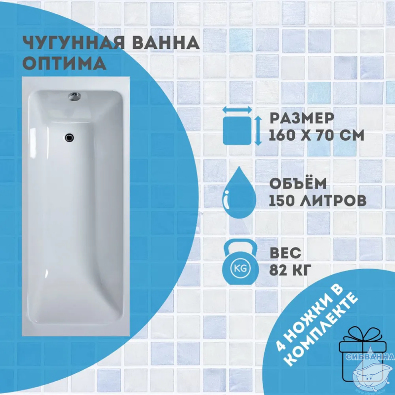 Чугунная ванна «Оптима» - ровные линии, прямоугольное дно и выраженный плоский борт. Идеальна для ванной комнаты в стиле минимализма. Длина чаши и минимальный полезный объем позволяют экономить потребление воды.
