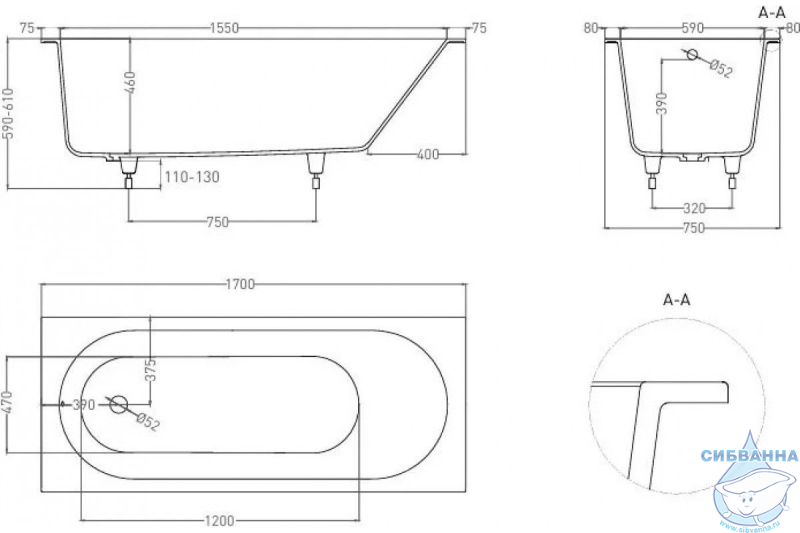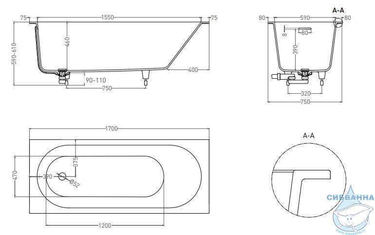 • ванна, интегрированный слив-перелив, сифон, донный клапан Click-clack, регулируемые ножки