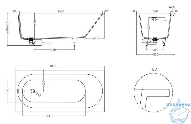 • ванна, интегрированный слив-перелив, сифон, донный клапан Click-clack, регулируемые ножки