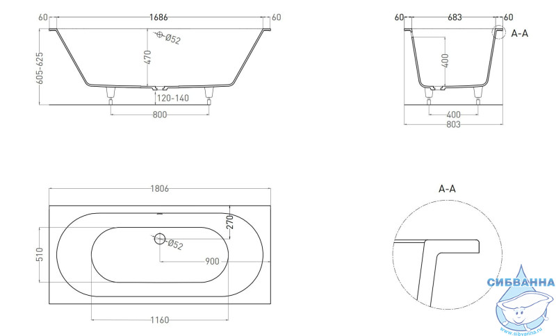 Модель подходит как для полного или частичного встраивания. Ванна отличается симметричностью за счёт центрального расположения классических круглых отверстий для слива-перелива и донного клапана, а также равномерного уклона боковых сторон изделия. Название модели Axis («Ось») подчёркивает её симметричный дизайн во фронтальной проекции. Модель не комплектуется сифоном и донным клапаном.