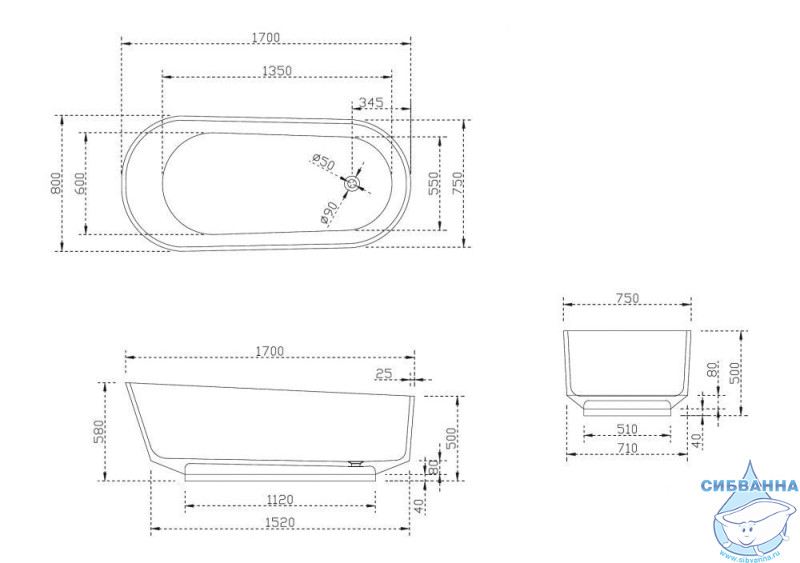 Длина 170. Ширина 80. Высота 58. Диаметр сливного отверстия 5. Расположение слива стандартное. Материал полиэфирная смола. Установка отдельностоящая. Форма овальная. Смеситель установка не предусмотрена. Объем, л 245. Комплектация донный клапан.