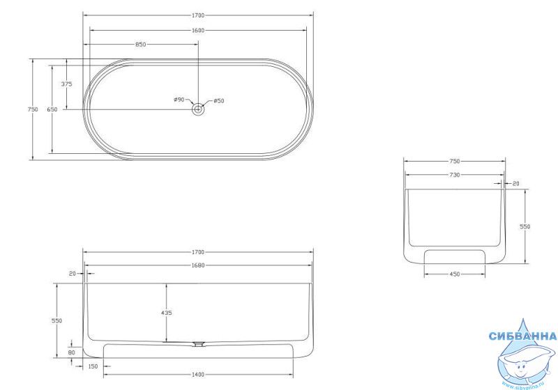 Длина 170. Ширина 75. Высота 55. Диаметр сливного отверстия 5. Расположение слива по центру. Материал полиэфирная смола. Установка отдельностоящая. Форма овальная. Смеситель установка не предусмотрена. Дополнительная информация максимально допустимая температура в помещении при эксплуатации изделия 50°. Объем, л 320. Комплектация донный клапан.