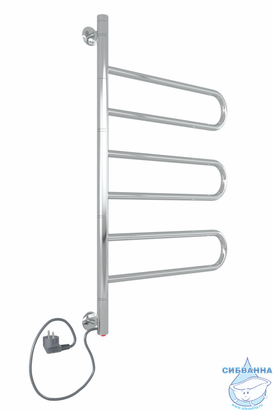 Полотенцесушитель поворотный оснащен кнопкой включения в нижней части стойки. Универсальность изделия предусматривает подключение через прямой провод или скрытое подключение через дополнительный модуль. Длина прямого провода 1,2 метра.
