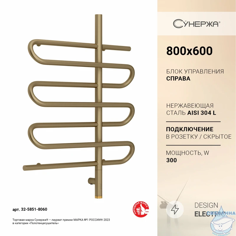 Полотенцесушитель электрический Сунержа Эпатаж 60х80 (с возможностью скрытого подключения, подключение (золото глянцевое)
