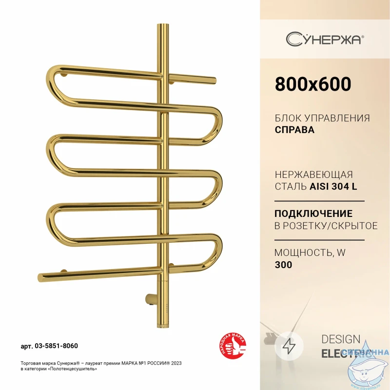 Полотенцесушитель электрический Сунержа Эпатаж 60х80 (с возможностью скрытого подключения, подключение (золото глянцевое)